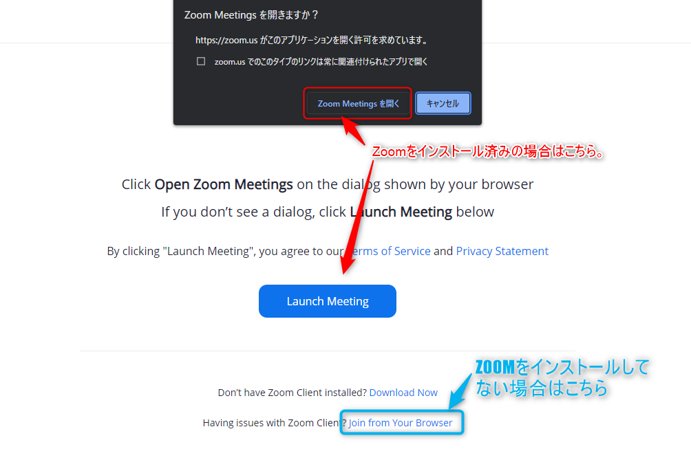 ご使用のパソコンにZoomをすでにインストールしている場合は、「Zoom Meetingを開く」をクリックしてください。