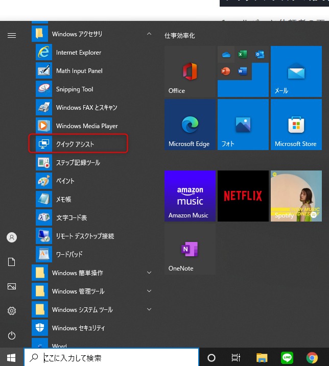 画面左下のWindowsマーク → 「WIndowsアクセサリ」 → 「クイックアシスト」から起動できます。