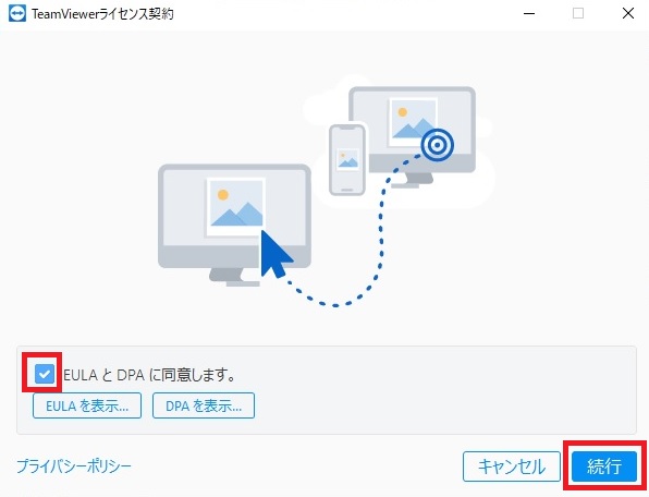 ライセンの確認の表示が出ましたら、「EULAとDPAに同意」のチェックを押し、「続行」をクリックしてください。